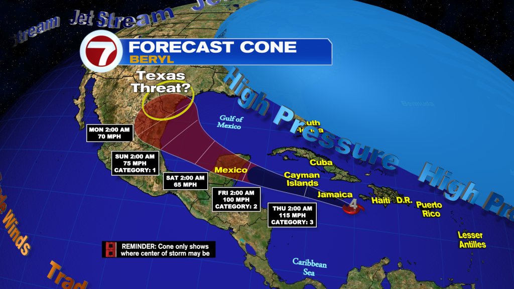 On the forecast track, Beryl is expected to be at or near major hurricane strength while it passes near Jamaica later today & Cayman Islands tonight or early Thursday. Weakening is expected thereafter, though it will remain a hurricane in the northwestern Caribbean.