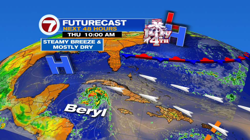 South Florida high pressure will be keeping a fresh onshore wind and Beryl well to our South in the Caribbean. Therefore, look for plenty of heat and humidity with a passing morning showers and afternoon inland storms on the 4th of July. Not looking bad at all for the fireworks shows. Just keep in mind that will be very hot and a Heat Advisory for Broward and Miami-Dade will run through 8pm.