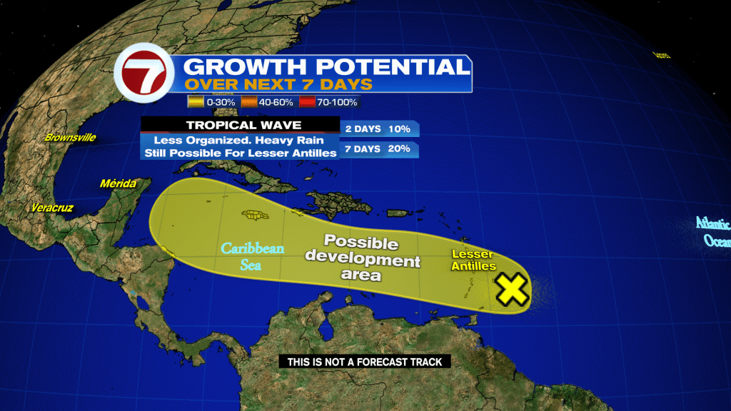 Tropical wave a few hundred miles East of the Lesser Antilles still has a low chance form during the next 7 days. Regardless of development, gusty winds and locally heavy rainfall are possible across portions of the Lesser Antilles today.