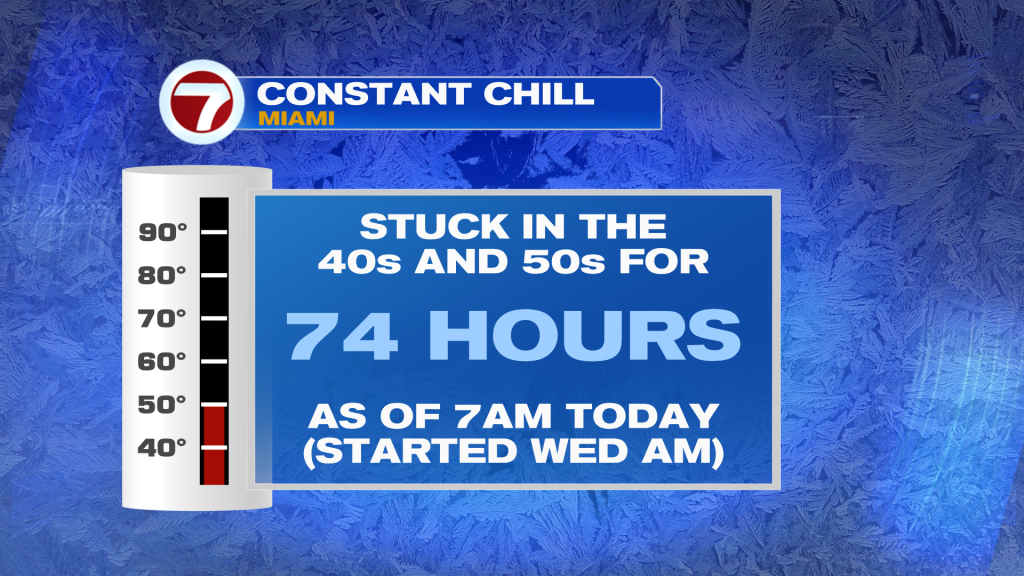 As of 7AM this morning, Miami has been stuck below 60F for an incredible 74 hours!