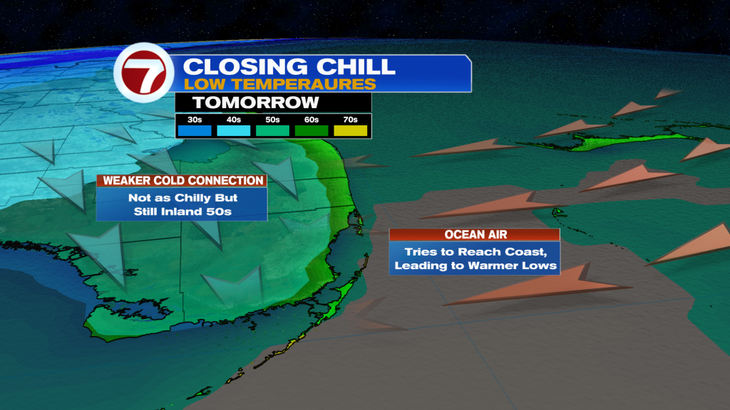 Therefore, wakeup temperatures Sunday will be milder but still a few degrees below average with widespread lows in the upper 50s as the cold air connection gets weaker.