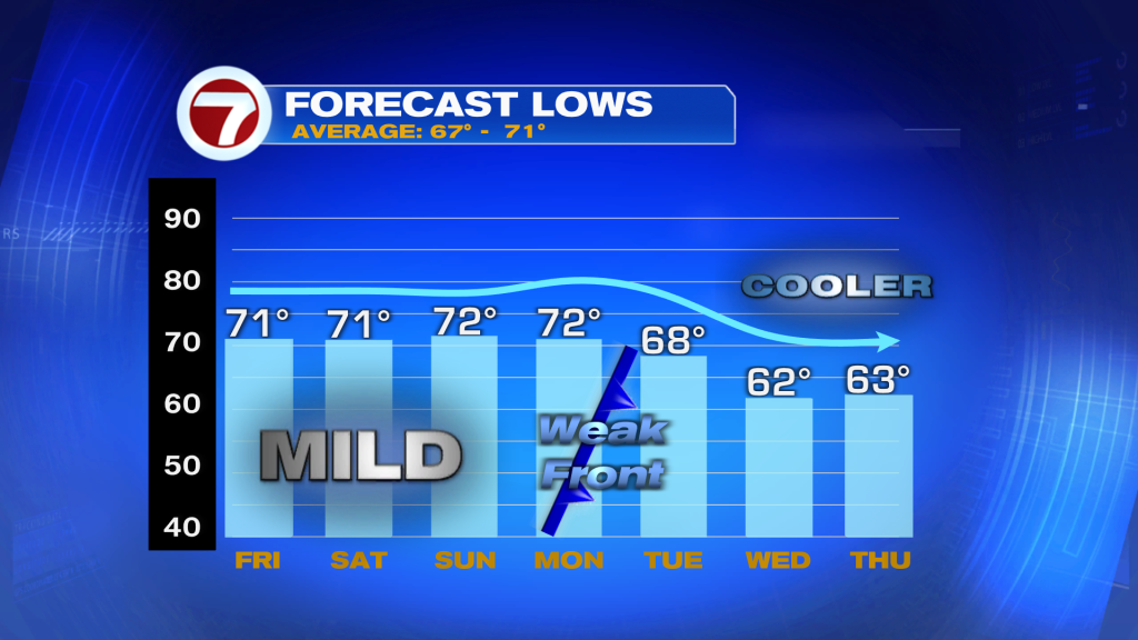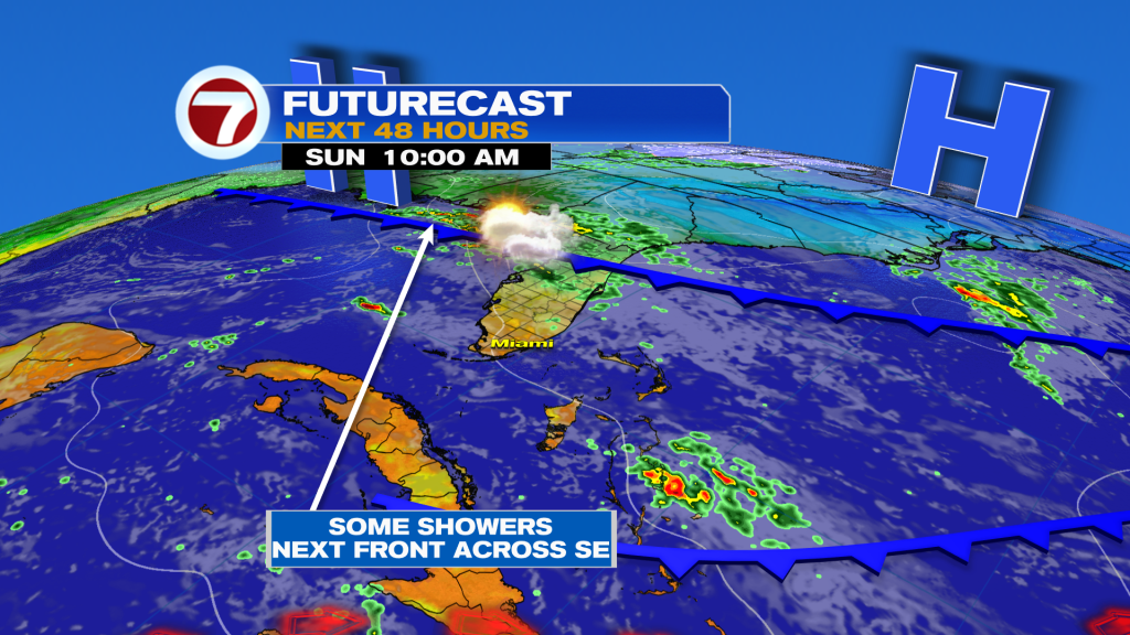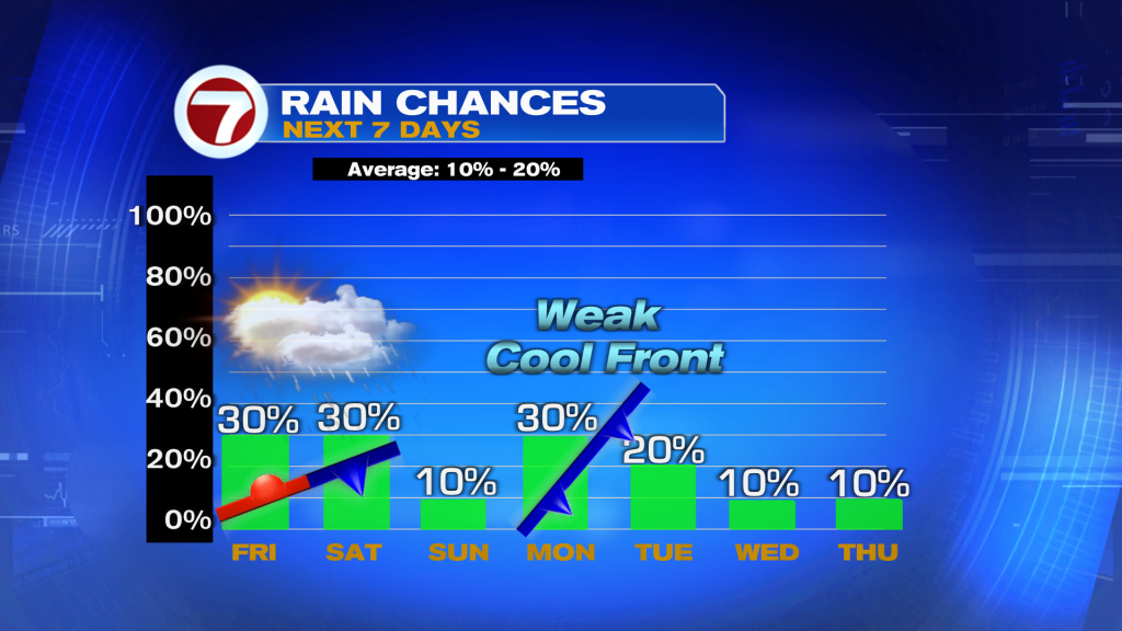 A chance continues for Saturday with fewer clouds throughout the day and pattern looking drier for Sunday. However, another weak “cool” front will be moving in early next week.