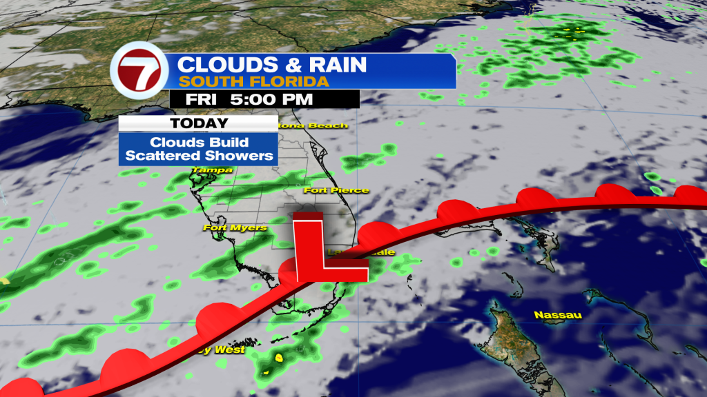 South Florida a front is lifting North and a minor disturbance has flared up in the Gulf, this will increase our coverage of clouds and potential to see scattered showers today. Best chance after 2pm.
