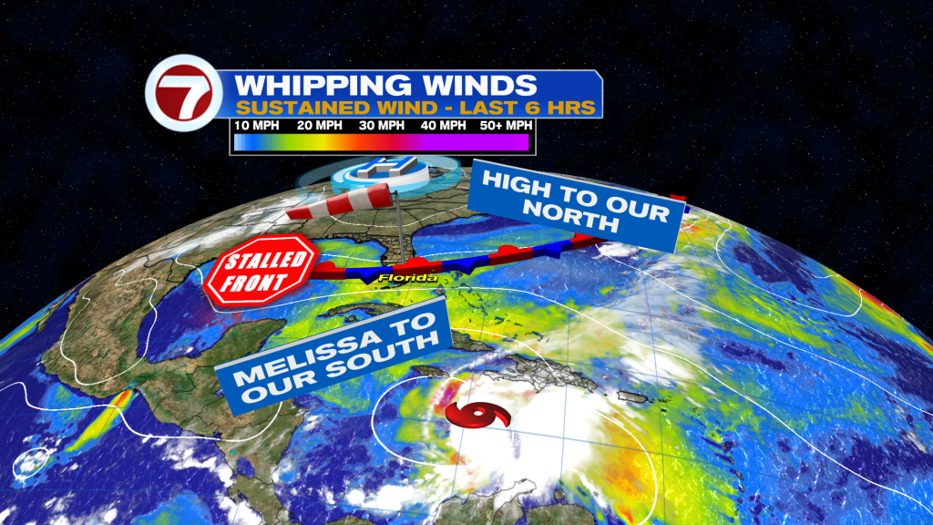 We can thank high pressure to our north, a front stalled on top of South Florida and strengthening Tropical Storm Melissa to our south for the whipping weekend winds.