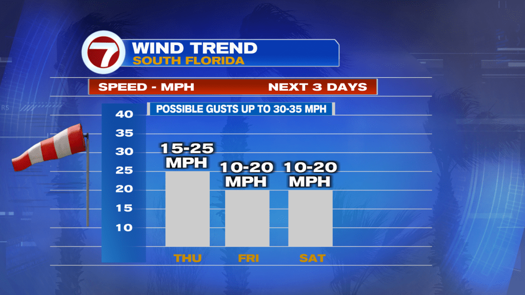 Looking ahead, the big breeze will be the main story for South Florida through the remainder of the work week. Windy to gusty conditions will stick around. Occasionally, wind gusts could reach up to 30 to 35 mph. With a strong area of high pressure once again in control of our weather pattern, South Florida should remain warm in the mid 80s but overall mainly dry. That means no major changes are expected through the upcoming weekend. However, early next week lighter winds return will cause our temperatures to warm into the upper 80s on Monday before a weak front reaches South Florida. This front could provide our next chance for scattered showers. A few isolated thunderstorms will be possible. No major cooldown is expected BUT we might see milder and more comfortable conditions by the middle of next week.