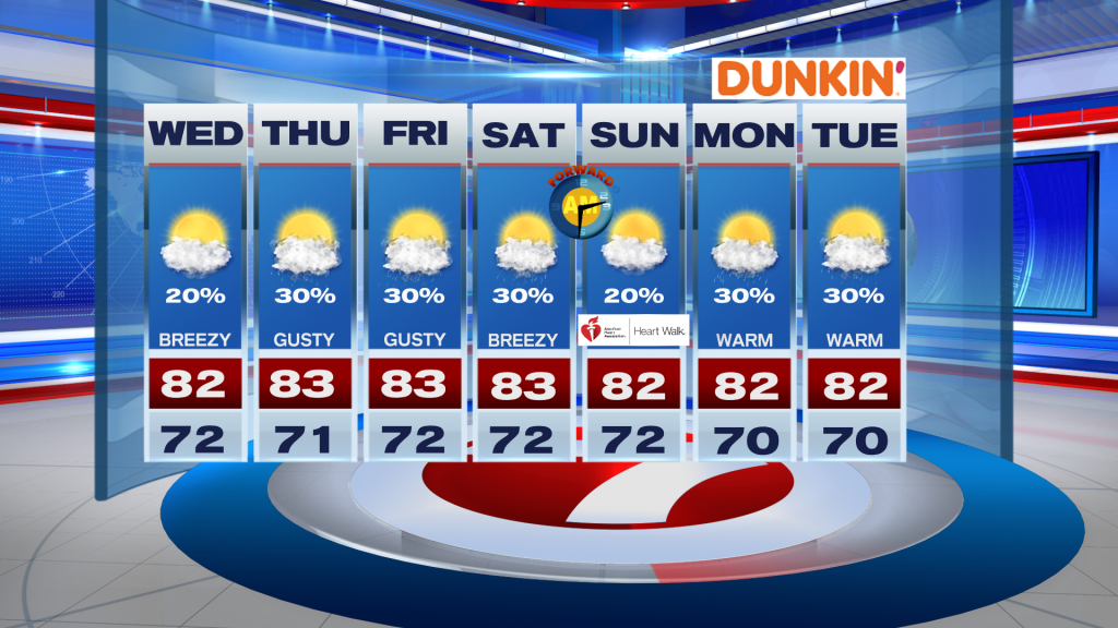 Looking ahead, the weather pattern stays fairly steady through the rest of the week. Breezy Easterly winds continue with a daily chance for a few passing showers, especially near the coast. East coast metro areas should stay in the low 80’s thanks to the onshore breeze, while inland and Southwest Florida warm up more. By the middle of next week, there are signs that it gets even warmer.