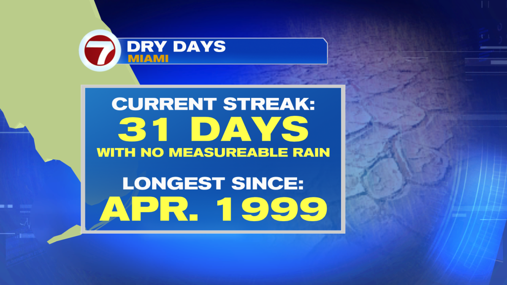 Miami International Airport only recorded a trace of rain on Wednesday, so the dry streak continues. This is now the longest stretch without measurable rainfall since April 1999!