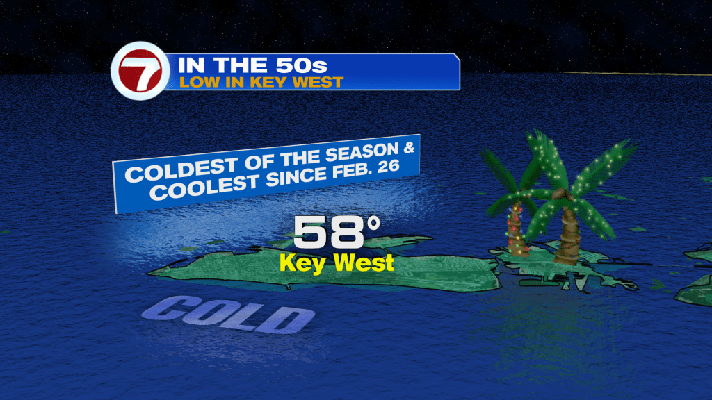 Key West has even reached the upper 50s, making it the coldest air so far this season and the coolest since late February!