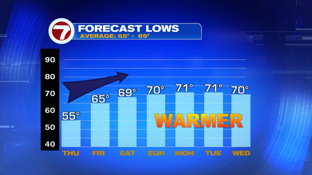 That strong, onshore wind will provide substantially warmer temperatures to start our Friday with widespread lows in the mid to upper 70s.