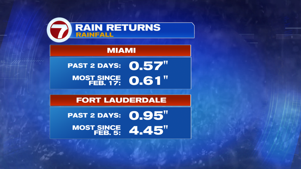 In Miami, the 0.57 inches of rainfall over the past two days (Tuesday and Wednesday) was the most since February 17 when 0.61 inches of rain fell. In Fort Lauderdale, just shy of 1 inch was recorded, which is the most in nearly two months!