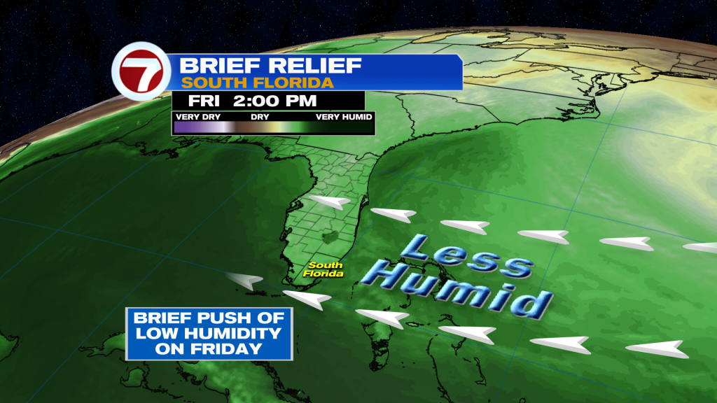 A weak front is moving through South Florida this Thursday, which was responsible for the heavy thunderstorms much of the metro received Wednesday evening. As this front slowly pushes through the area, it will introduce milder temperatures and lower humidity — but it won’t last long.