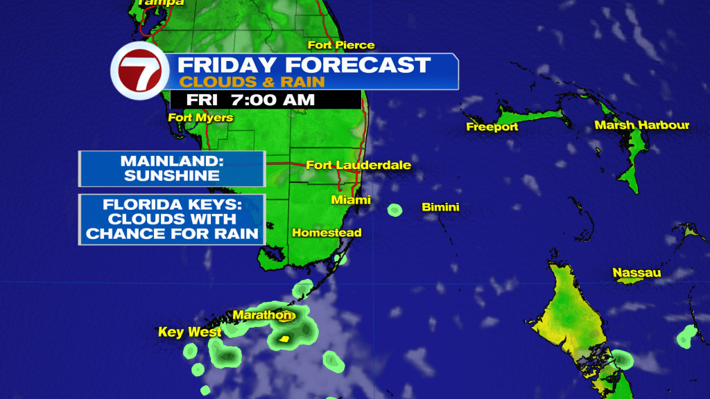 Speaking of the Keys, that’s where additional showers and areas of cloudiness are expected to start the day Friday while mainland areas should see sunshine and dry conditions.