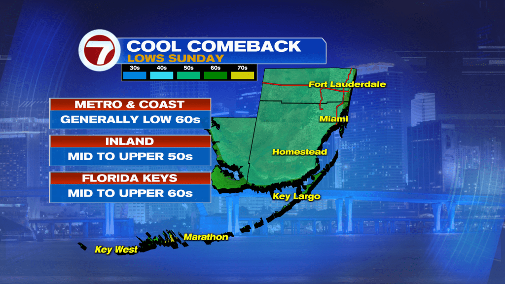 Low temperatures tonight will be close to normal, dropping to the mid to upper 60s across mainland locations and the low 70s for most of the Florida Keys.