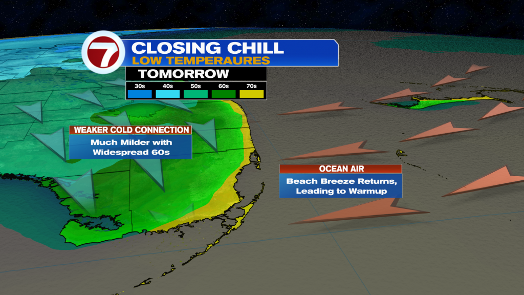 That easterly breeze will keep temperatures milder and seasonable with widespread lows both days this weekend in the mid to upper 60s.