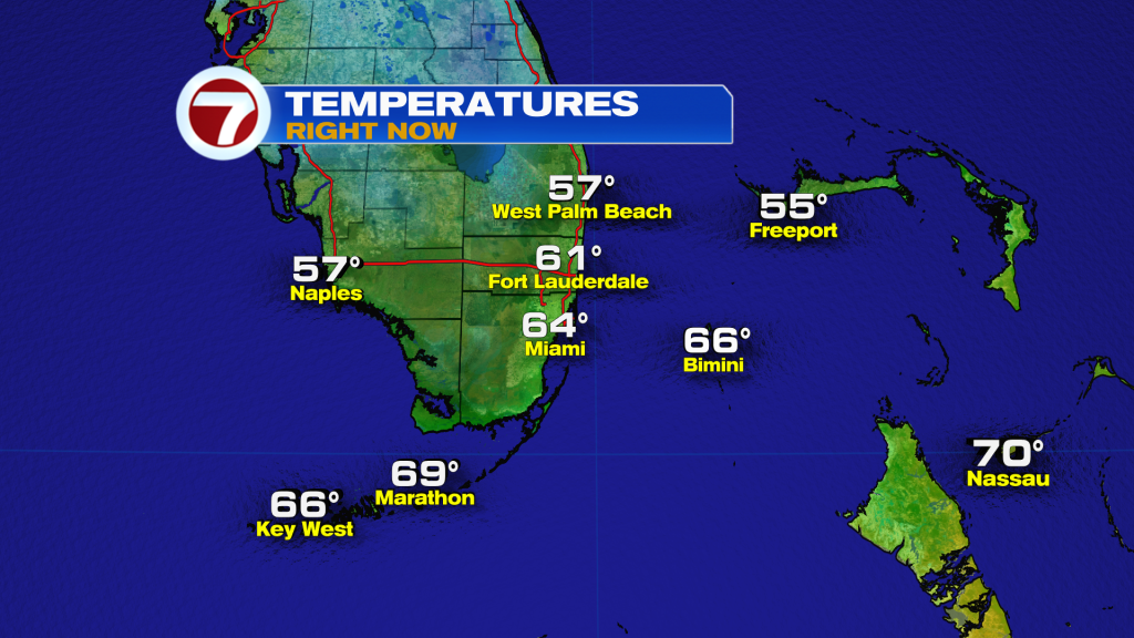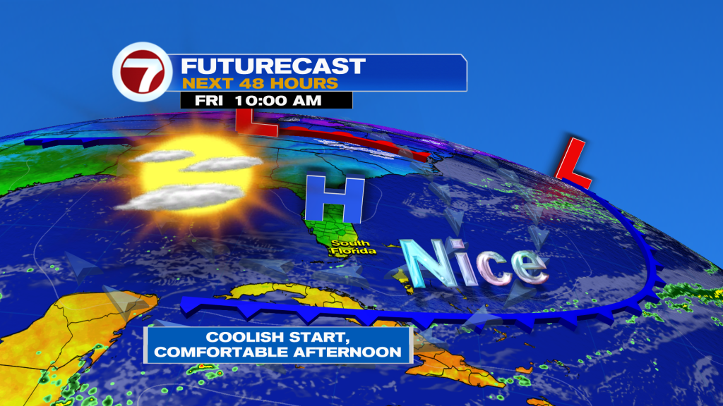 Today South Florida can expect a picture perfect day. After cool temperatures in the 50s and 60s this morning, our wind pattern will begin to change and that’s going to make all the difference. The area of high-pressure that brought cold air with it (because of the northerly wind flow), will now begin to move into the Atlantic, causing our wind pattern to veer off the water later today. With the return of ocean air, we can expect milder temperatures this afternoon in the upper 70s. It will still feel very comfortable. Other than passing clouds, South Florida will remain dry.