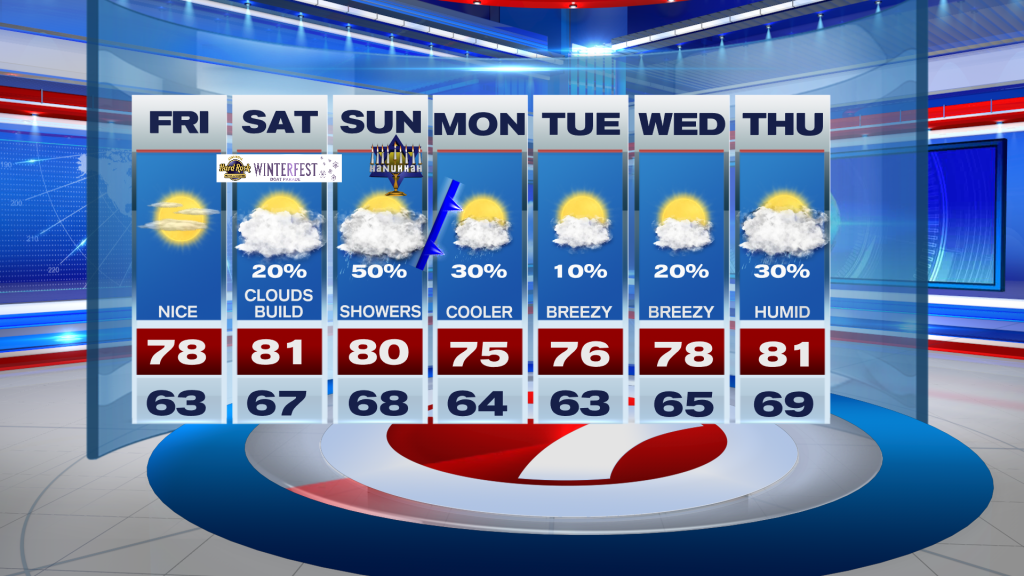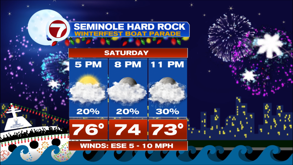Looking ahead to the weekend, South Florida will feel and see bigger changes. On Saturday cloud cover will build across the region and turn mostly cloudy by the afternoon or early evening. The reason? The front that came through Thursday evening and brought the reinforcing shot of cool will nudge northward a little closer to South Florida and bring its associated moisture with it. So if you’re heading out to the Seminole Hardrock Winterfest Boat Parade on Saturday evening, your forecast is looking pretty good. Most of the day should remain quiet (except soggy in the FL Keys) with a few very late day showers possible. A very different case for Sunday. Scattered showers will return to the forecast for the latter part of the weekend as that old front pushes moisture in our direction.