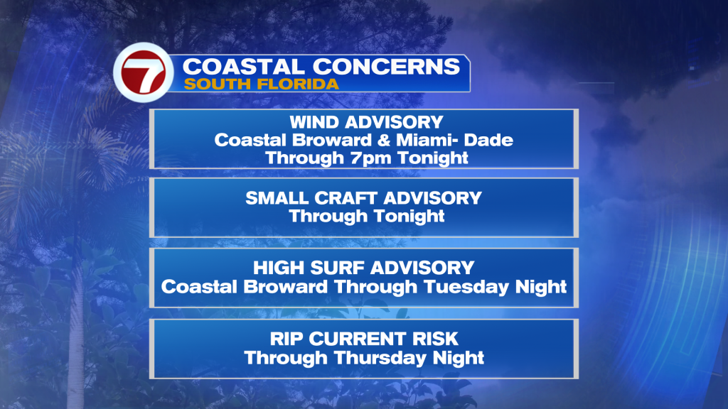 A Wind Advisory will be in effect for Coastal Broward and Miami-Dade through tonight with occasional gusts up to 35 mph. This can toss unsecured loose objects like Christmas decorations. Also, it could making driving difficult if you have a high profile vehicle, so drive with extra caution.