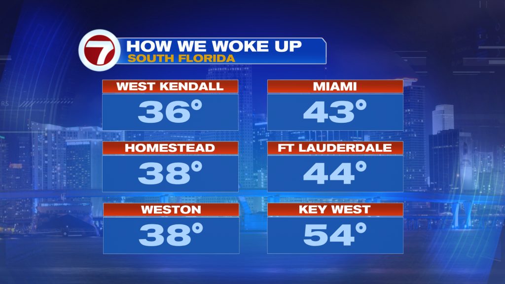 South Florida is waking up to some of the coldest air we’ve felt in a while. An extremely dry air mass is in place, and clear skies with light winds overnight allowed temperatures to really drop. Much of inland South Florida is in the 30’s, while coastal Broward and Miami-Dade are waking up in the 40’s — and it feels even colder with wind chills.