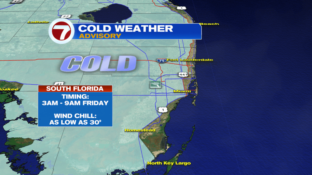 As a result, the National Weather Service has issued a Cold Weather Advisory for metro and inland Miami-Dade and Broward Counties from 3AM-9AM Friday for forecast wind chills as low as 30F.