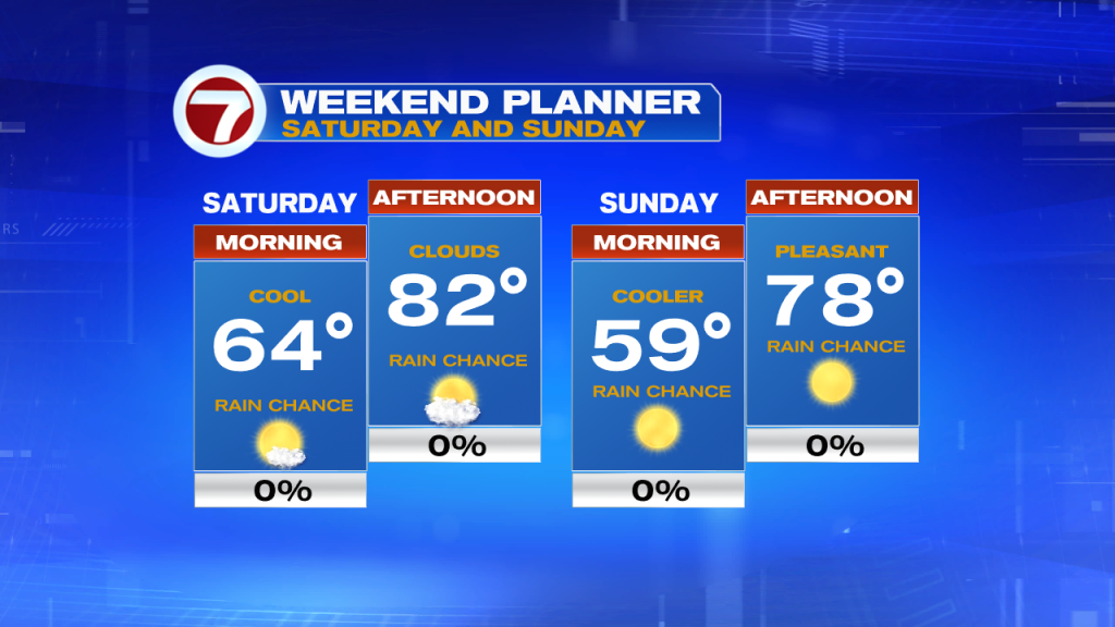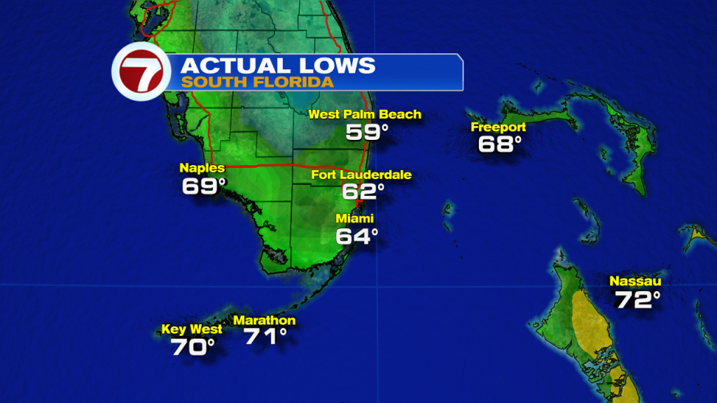 After very nice and comfortable conditions across South Florida today, the latter part of the weekend promises even nicer weather. On Sunday we can expect an even cooler start to our morning with most of South Florida waking up in the lower 60s but there could be some areas that could wake up in the upper 50s! So if you’re heading out late tonight for any Saturday night plans, you may want to have a light sweater with you just in case. Sunday afternoon promises more sunshine, still low humidity but also cooler afternoon temperatures. Highs will only be reaching into the upper 70s on Sunday and with a normal high temperature of 83° this time of year, that means our temperatures on Sunday will be below average.