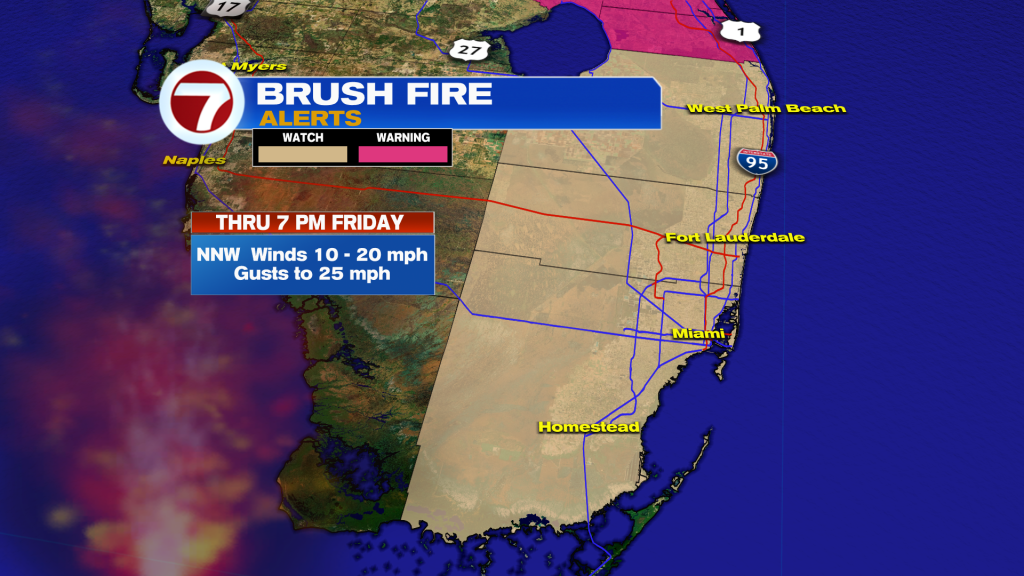A Fire Weather Watch has been issued for Miami-Dade & Broward Counties today until 7pm as critical fire conditions return to South Florida. South Florida will be extremely dry behind this morning’s front, humidity levels will likely drop to about 20% to 30% and gusty NW winds are now in place. All of this, together with an upgraded severe drought condition, will increase fire threat across the area and cause any fire to spread quickly. Due to the change in wind direction, the smoke that has been blown into metro and coastal areas of Miami-Dade and Broward will now be blown mostly into the Florida Keys.