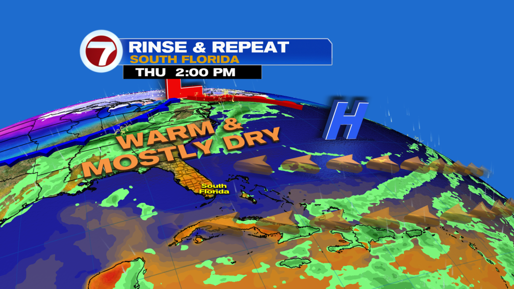 What we experienced Saturday will be very similar to what we witness these next 7 days. High pressure will deflect future fronts this week well away from South Florida, keeping the region relatively warm and mostly dry.