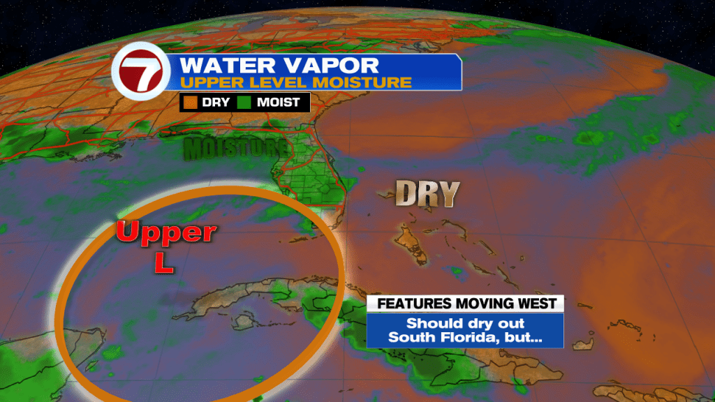 Looking ahead, an upper low and its moisture is moving away allowing drier air to filter in. HOWEVER, there will be enough lingering moisture for scattered storms in the afternoon.