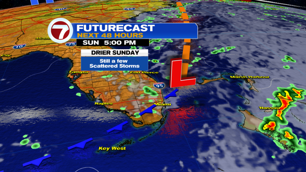 A Fall Front will slowly fall apart over South Florida on Sunday. It’s attached to an area of low pressure offshore. While sunshine will be more abundant, there will be just enough lingering moisture that could help develop some scattered storms.