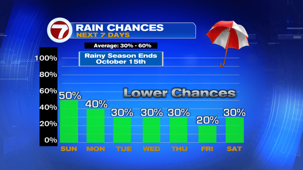 The low, could stay nearby through Monday, adding some instability that should help produce a few storms. On Tuesday, we start a dry spell that is forecast to last through next weekend. Can’t rule out a stray shower but in general we start to gradually transition to dry season. The rainy season ends October 15th.