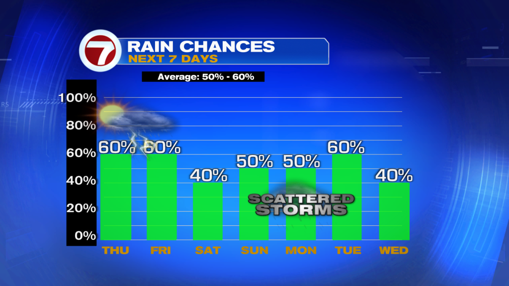 For our Thursday, it will not be a washout either but rounds of showers and thunderstorms are expected, especially near the coast during the morning hours and inland during the afternoon. Otherwise, expect more clouds than sunshine with high temperatures generally in the upper 80s.