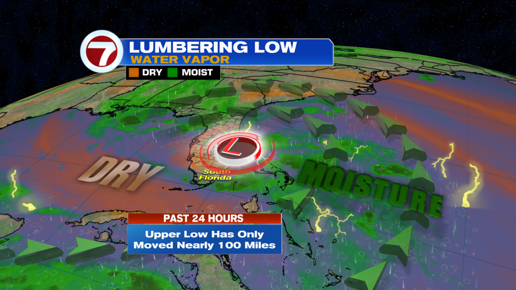 A large, lumbering low in the mid to upper levels of the atmosphere remains stuck nearby, keeping moisture and active air across the region.