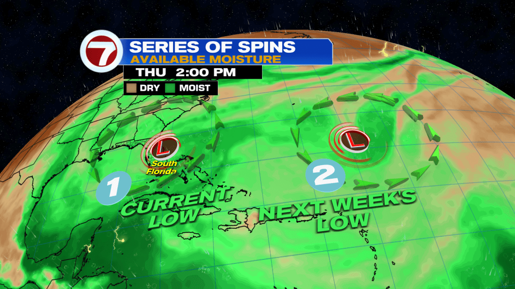 A second low is forecast to move over Florida early to mid next week, too, keeping shower and storm chances elevated in the 40-60% range.