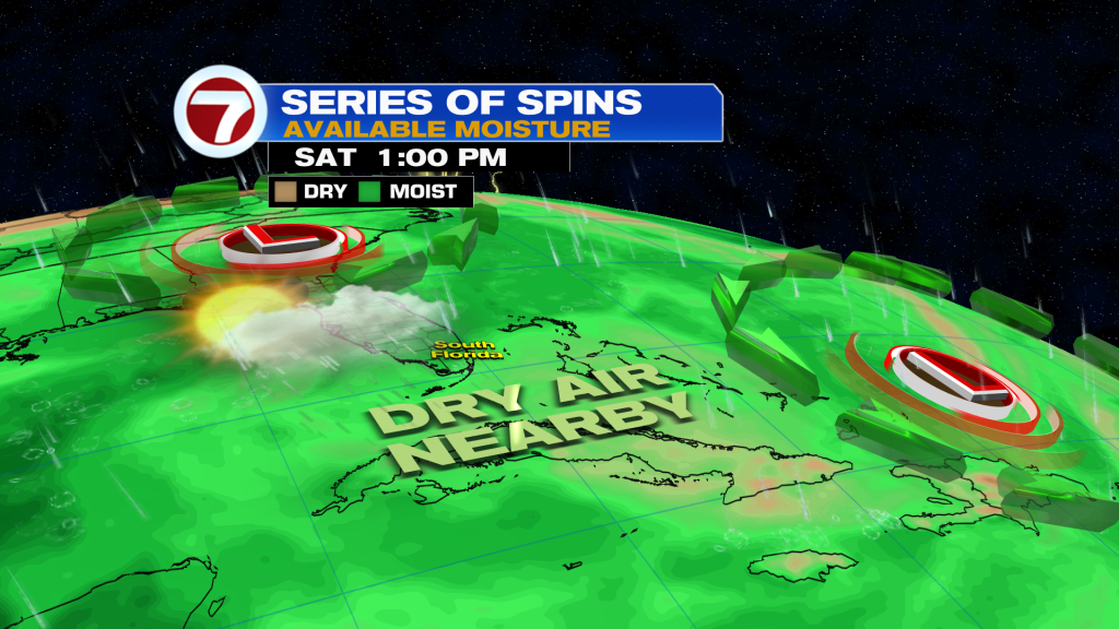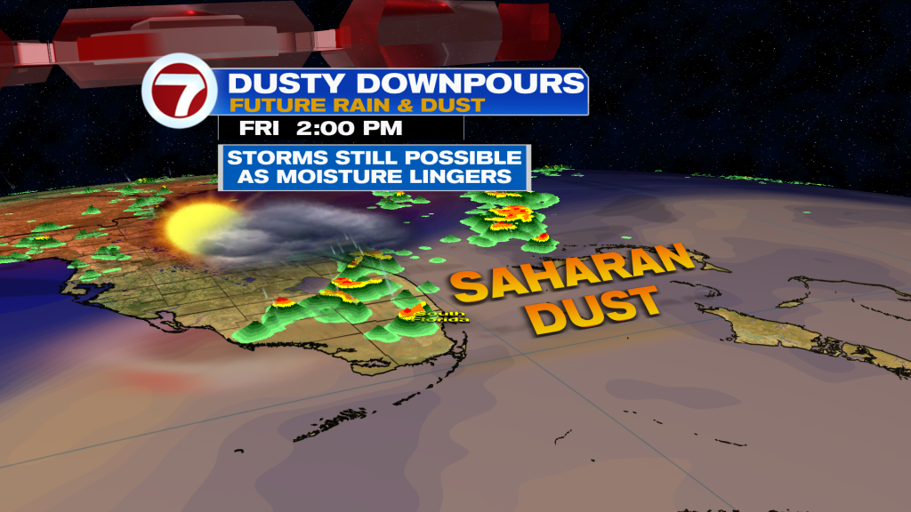 For our Friday, scattered storms will remain possible at times but Saharan dust will also move in. This will try to suppress rain chances but with moisture and the upper low still in place, that will keep rain chances around.