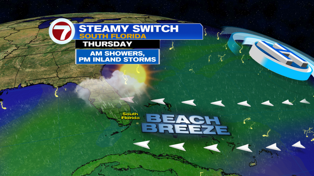 Along with that ocean breeze returning, scattered showers and storms will also return mid to late week. Overall, we can expect a few morning showers and then afternoon, inland thunderstorms with this pattern.