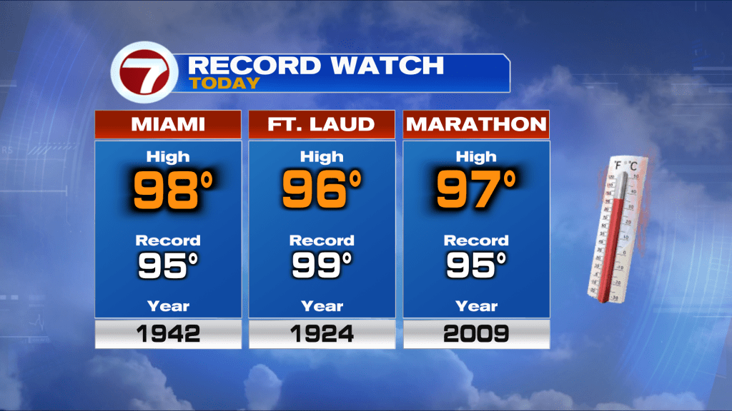 Aside from record heat being possible — if not likely — in both Miami and Marathon again today, Miami has a shot at reaching 98F, which is our forecast high. Most years never reach a temperature that high and the record for most days with a high of at least 98F is 2 days, which happened in back-to-back years of 2019 and 2020!