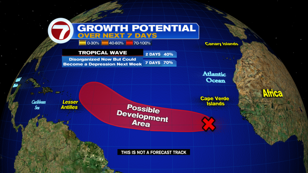 In the tropics, a tropical wave now being investigated and given the designation, Invest 92-L, by the National Hurricane Center now has a high, 70% chance of tropical development over the next week as it tracks west across the open waters of the Atlantic. It’s currently located near the coast of Africa and by next weekend, it will be near the Lesser Antilles or to the north of there. The more organized and stronger the system is, the more likely it is to turn more to the north by this point in time. Here in South Florida, it is not a concern at this time.