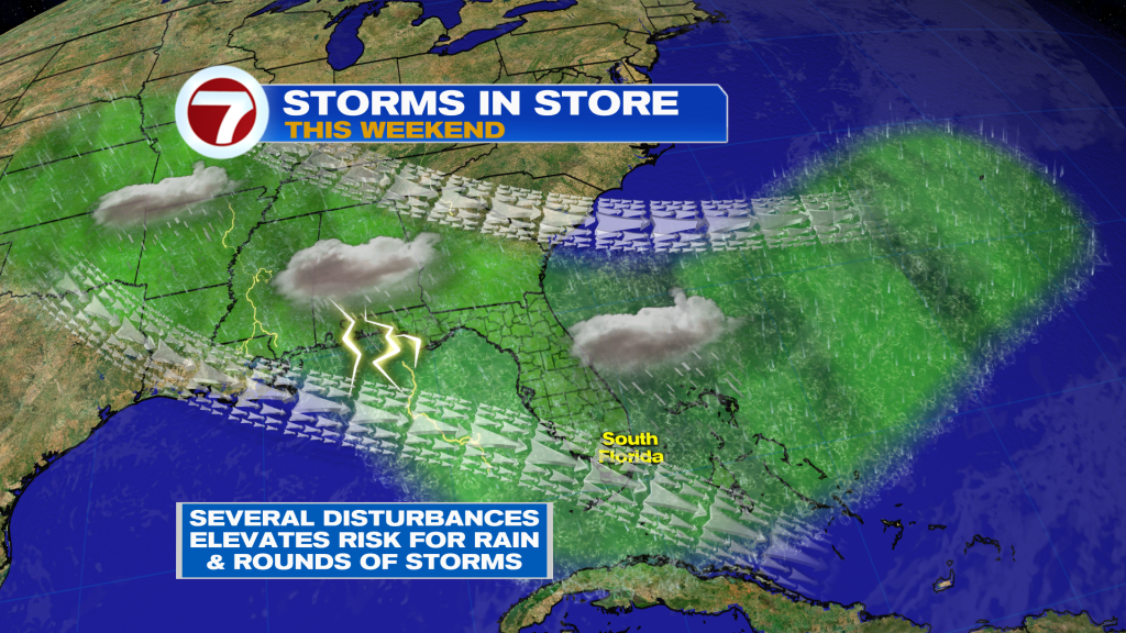 Several disturbances heading southeast into Florida will help stir up the atmosphere over the next few days along with more moisture in place, making the environment for favorable for seeing thunderstorms.