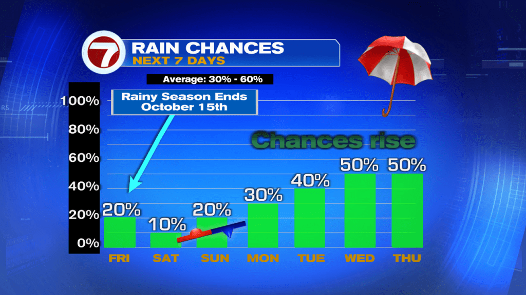 Rainy season comes to an end on Friday. The end of the week should be warm, sunny, with only a slight chance for showers. A front arrives on Sunday, with very little fanfare. About the only thing it will do is bring our temps down to average. Saturday and Sunday will see temps in the upper 80s, after the front, they’ll come down to our typical 86°.