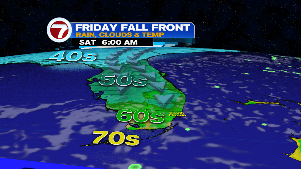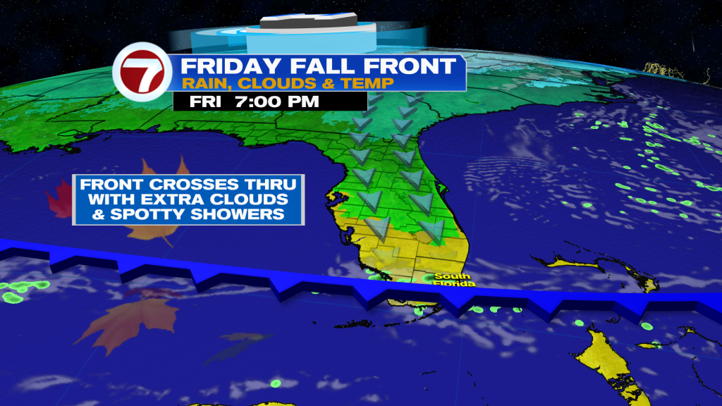 A fall front is crossing through South Florida Friday afternoon, knocking high temperatures down from the mid 80s to the low 80s for the weekend. It doesn’t sound like much and it really isn’t but it will be a nice change given how warm it’s been this November so far. Humidity levels will also be lower behind the front.