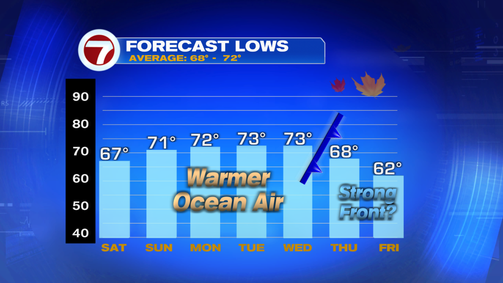 Expect wakeup temperatures Saturday morning to be the coolest since back in April for both Miami and Fort Lauderdale. Lows will be in the mid to upper 60s courtesy of a northerly wind behind the front.