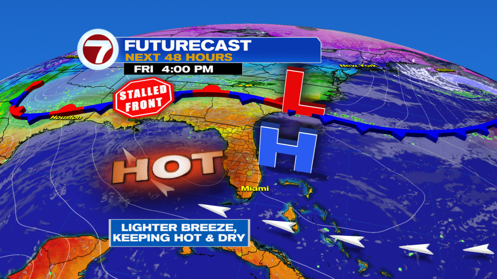 Looking ahead, there are some changes to the forecast, however, not the change that we hope to see. The weekend continues to be on the warm side with afternoon high temperatures reaching into the mid 80s. Sunny skies and a warm Southeast breeze will start our weekend off but then the weather pattern begins to change for the latter part of the weekend. Our wind pattern will veer out of the Southwest by Sunday. This will trigger a warming trend across our area (as if temperatures weren’t already warm enough!). The start of next week promises this trend of steamy temperatures and dry conditions to continue. Our afternoon high temperatures could possibly reach into the upper 80s and lower 90s before a weak front tries to move into South Florida on Wednesday. Unfortunately any significant cooldown is not expected with this one. Models are suggesting that temperatures will drop back down to the mid 80s (versus the upper 80s and low 90s we could experience at the start of the week). Whatever ‘brief relief’ this weak front brings to South Florida will be short-lived as our afternoon high temperatures continue to warm by the end of the week. Also worth noting, South Florida will remain dry through this entire forecast period.