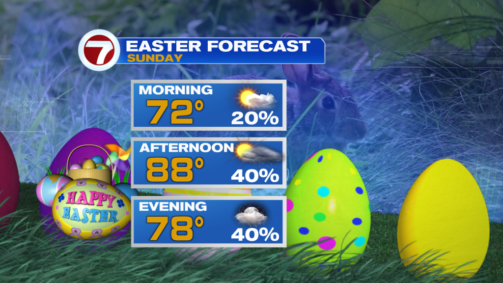 If you have Easter egg hunts/activities happening on Sunday, get them done early. We will have morning sunshine followed by afternoon storms developing inland and pushing towards the coast due to steering winds out of the West.