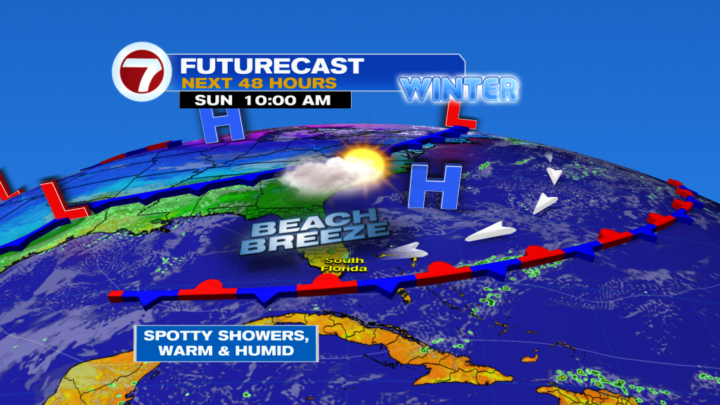 Sunday will start off with some patchy fog inland, but will remain warm and fairly humid from start to finish. Expect sunshine, patchy clouds and some spotty showers rolling onshore with the building breeze. This will also make for nice beach weather with a low rip current risk!