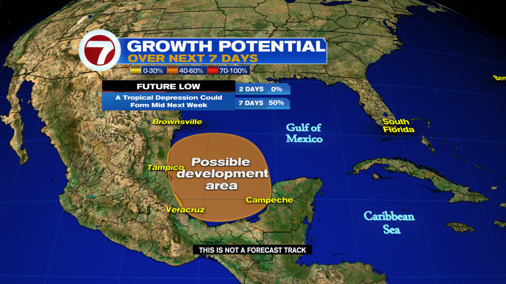 Area of low pressure is forecast to form over the Southwestern Gulf of Mexico early next week. Conditions seem favorable for slow development of this system, and a tropical depression could form by the middle part of next week while the system moves slowly Westward or West-Northwestward. Regardless of development, plenty of rain is going to spread for several days across portions of Southern Mexico and Central America where life-threatening flooding could happen. NHC giving this area a medium chance to form during the next 7days.