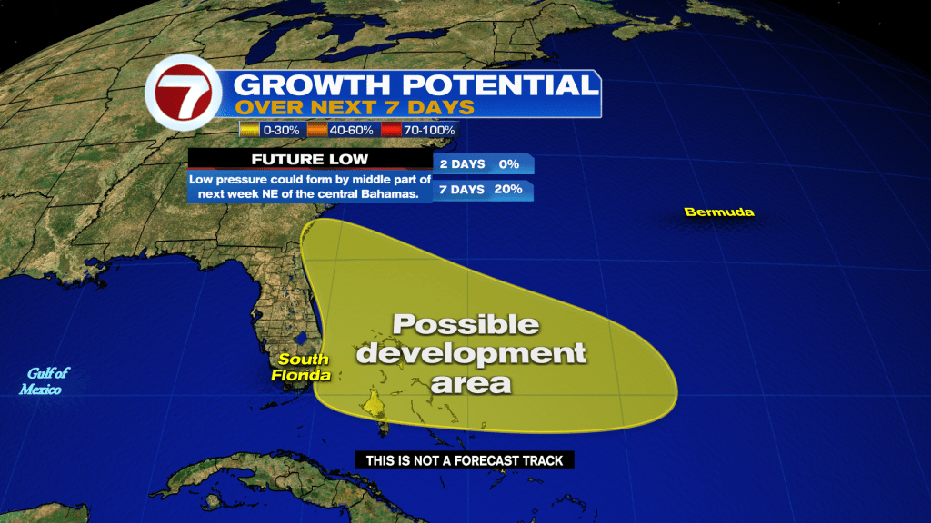 An area of low pressure could form by the middle part of next week a few hundred miles northeast of the central Bahamas. Some slow development of this system is possible while the system moves westward or west-northwestward.