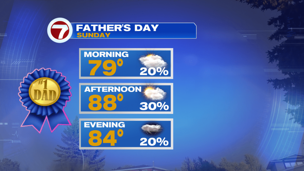 On Sunday (Father’s Day), high pressure starts to build across the Southeast United States to bring in some drier air region. While there is still plenty of cloud cover, expect more peaks of sun during the day and lower rain chances. Isolated showers possible on an ocean breeze.