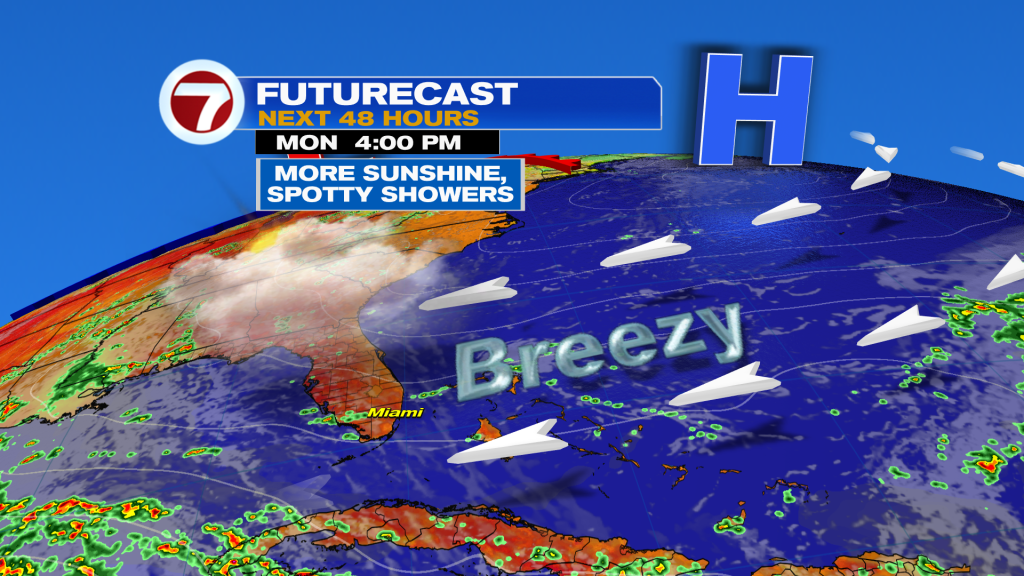 The breeze builds early in the week with long range models showing a typical Summer-time pattern setting up shop. This means morning sun with a passing shower on the breeze and afternoon sea breeze driven activity with the daytime heat. Mid to late next week could get wetter once again if model trends continue.