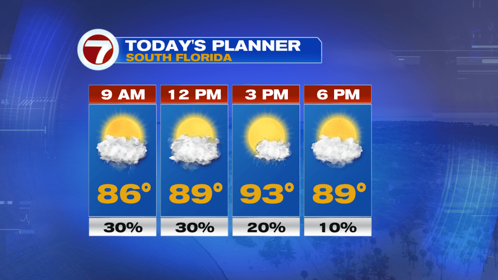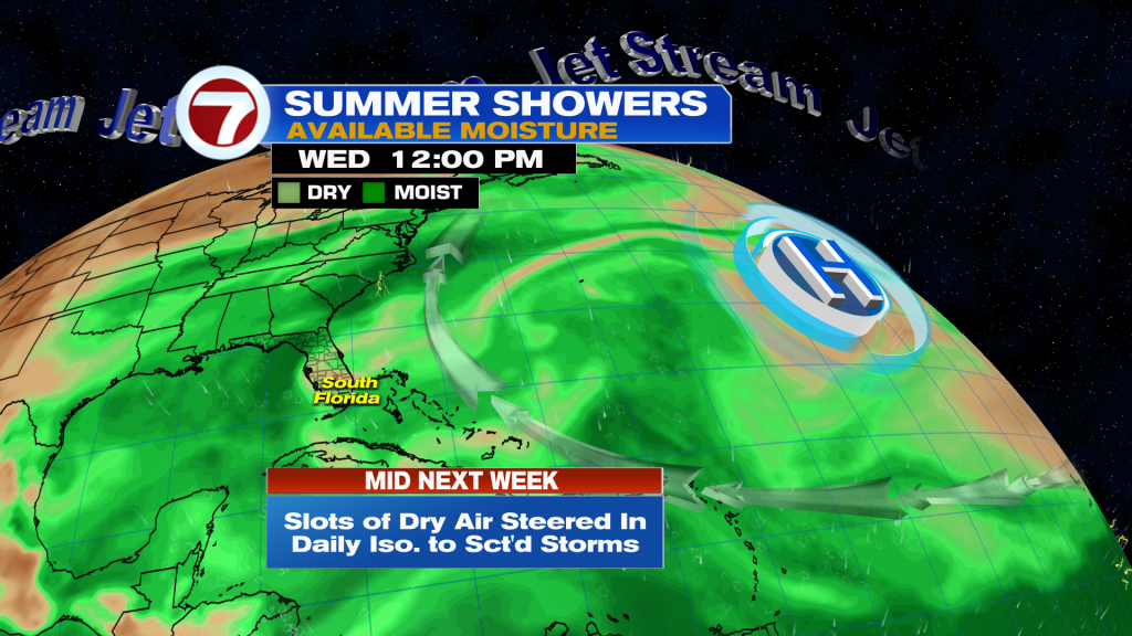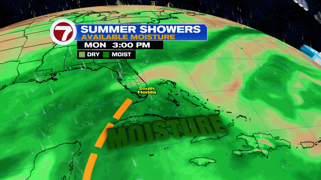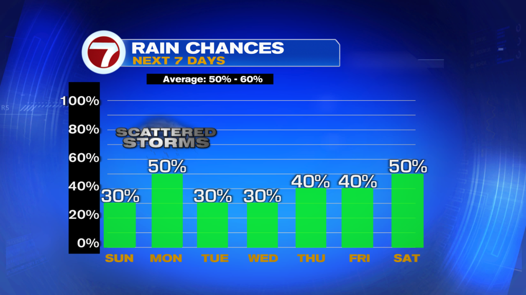 Now on Monday, rain chances will rise back up as a tropical wave skirts by to our south across the Caribbean Sea. This will steer in a bit more moisture for our Monday, leading to scattered showers and storms. With an onshore wind flow in place, rain chances will be highest across the area during the first half of the day.