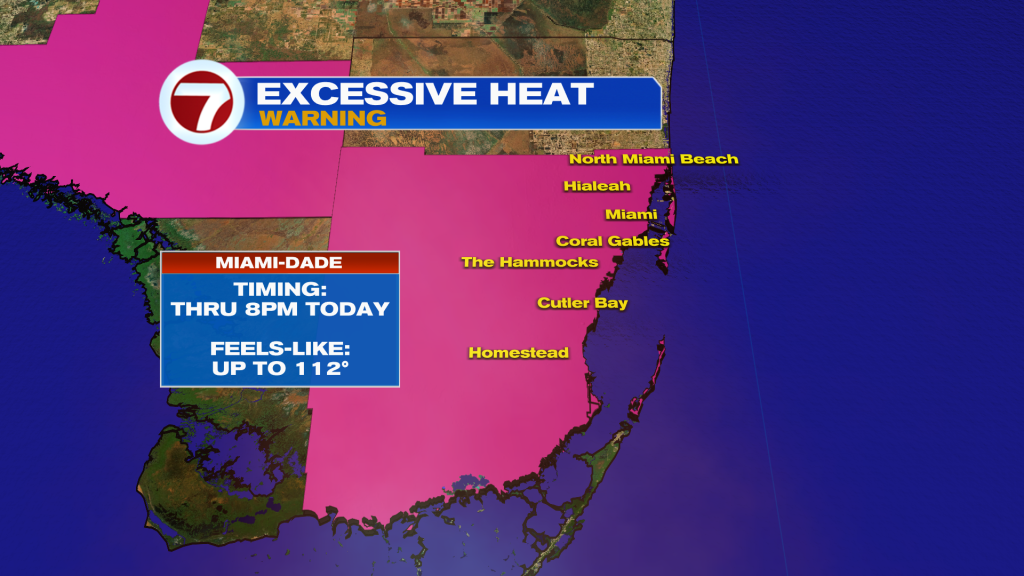 *Excessive Heat Warning for Miami-Dade until 8pm. Once it expires Heat Advisory will replace the warning and run through Sunday. This is the second time ever that any portion of our region is under an Excessive Heat Warning, which means that the risk for heat related illnesses is significantly higher.