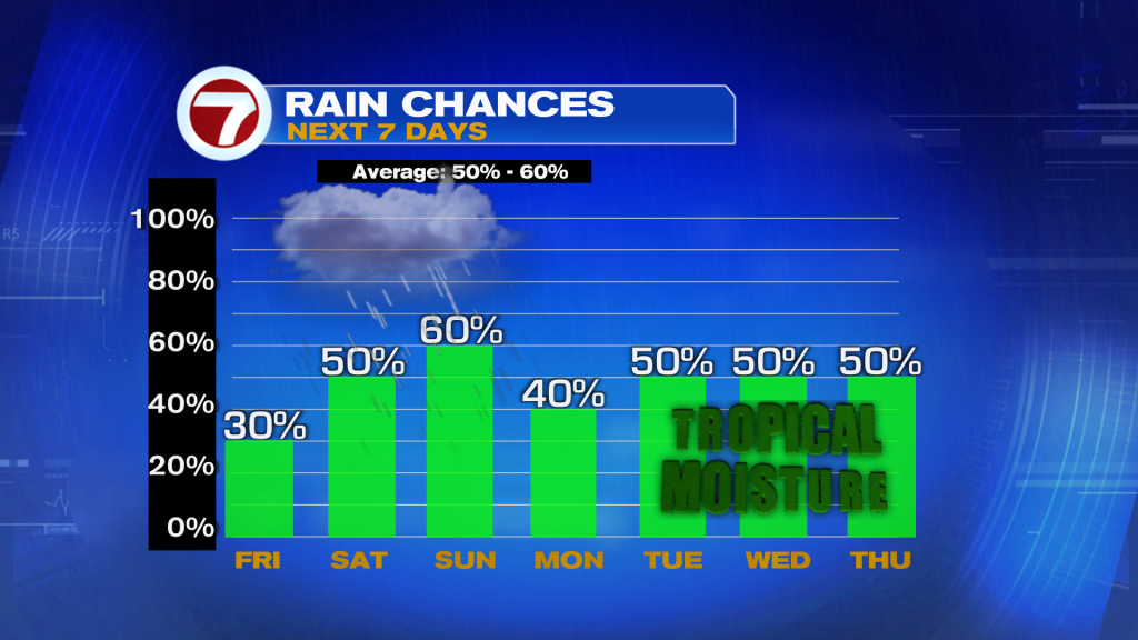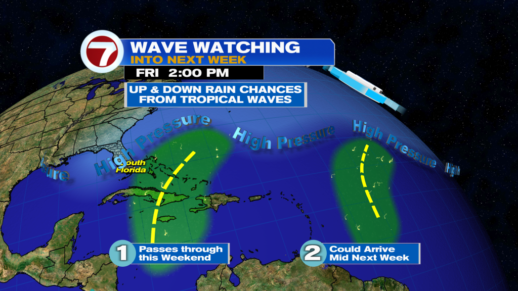 Another tropical wave could enter the picture mid-next week, meaning higher rain chances once again. With more clouds and showers overall next week, high temperatures should be closer to normal, generally hovering into the low 90s.